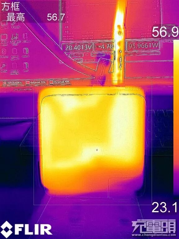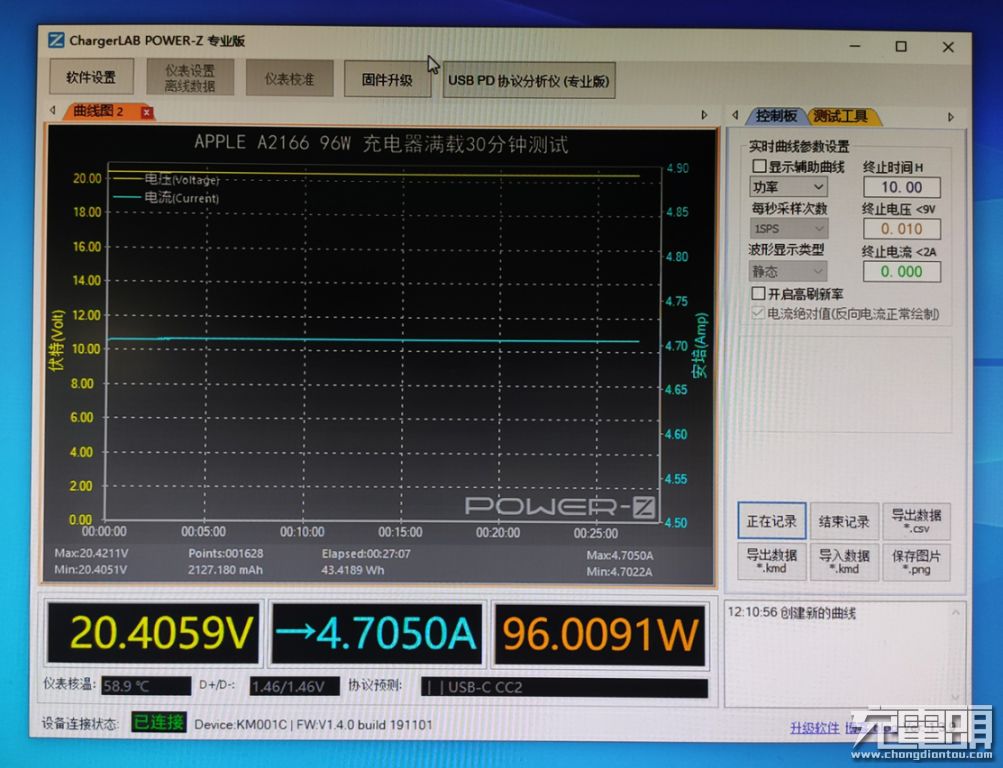 使用ChargerLAB POWER-Z上位机记录输出参数,按照苹果96W标称的20.5A 4.7A参数设定电子负载数值,以96W满载功率运行半个小时,电流电压值十分稳定,并且使用热成像仪记录温升热量。