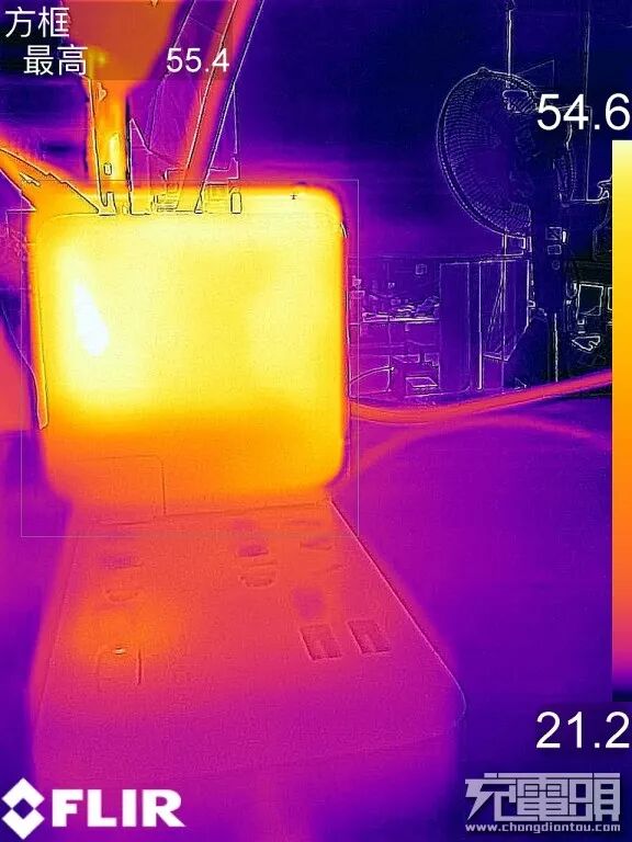 充电器logo反面热量最高为55.4度,整体发热均匀。