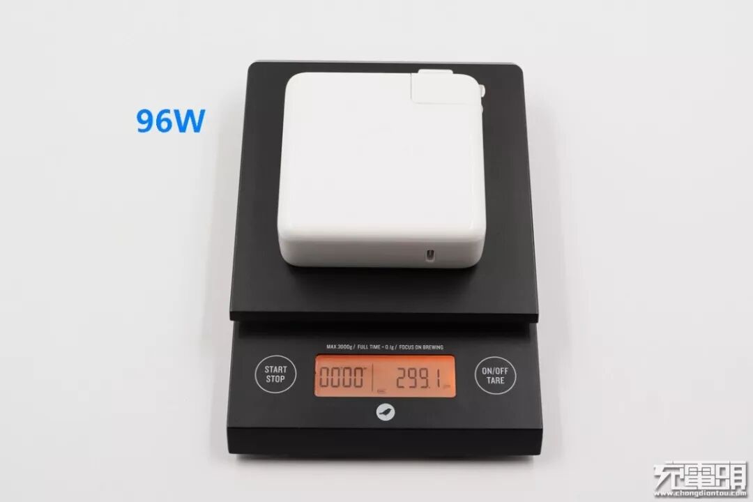 从表格中可以看出,96W充电器的重量是最大的,为299.1克,体积最大和功率密度也是苹果现有充电器中最大的。