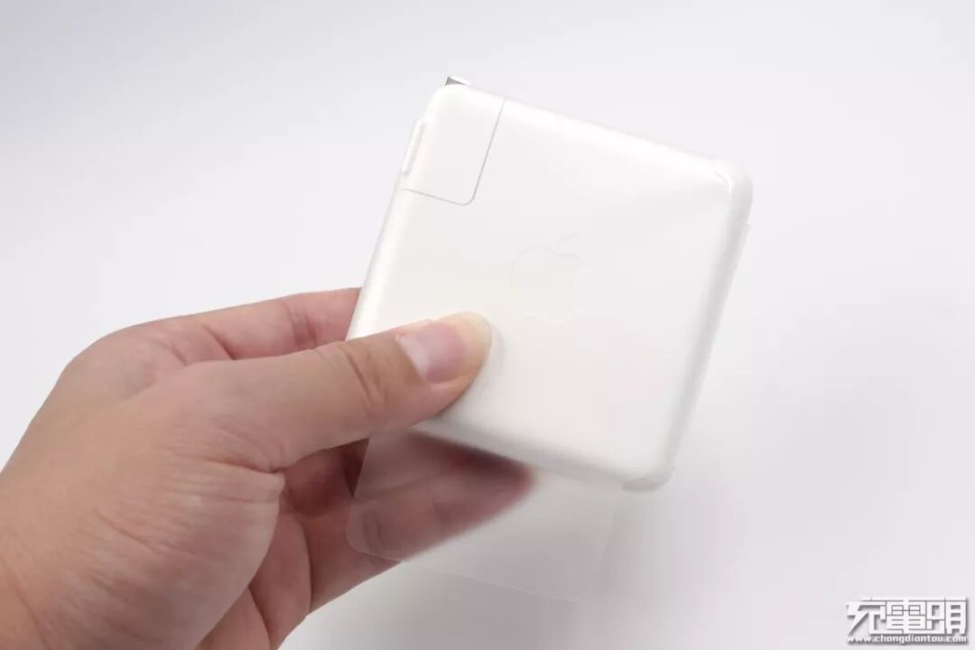 整体经典的苹果设计风格,机身壳表面采用亮面烤漆工艺,各棱边均为光滑弧面过渡,不会硌手,充电器正中位置凹印苹果logo。