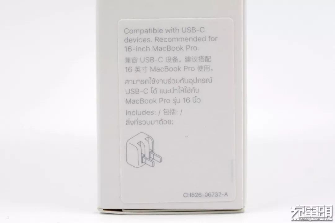 另一侧标签贴纸,电源适配器兼容支持USB-C的设备,搭配16 英寸 MacBook Pro使用时能发挥最佳充电效果。