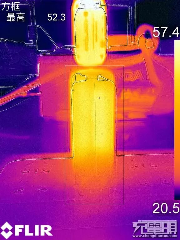 充电器另一个侧面热量最高为52.3度,整体发热均匀,无热量积聚点。苹果96W效率高,温升低,最高热量也只有58.2度、内部热量控制工艺优秀。