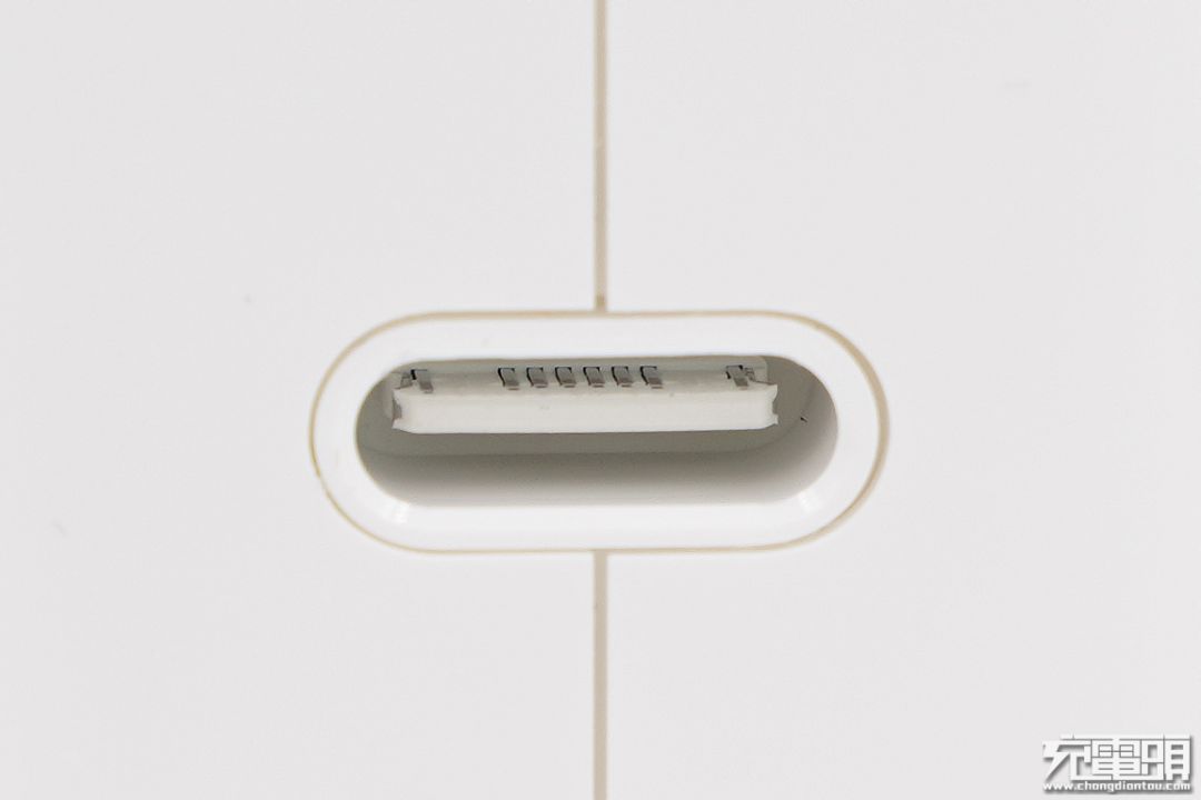 苹果96W充电器输出母座为全白设计,看上去很像塑料材质,小编在另一篇拆解文章里对接口进行了拆解,发现里面是塑料包裹着金属骨架设计,不是纯粹的塑料。内部白色舌片,触点非满PIN。