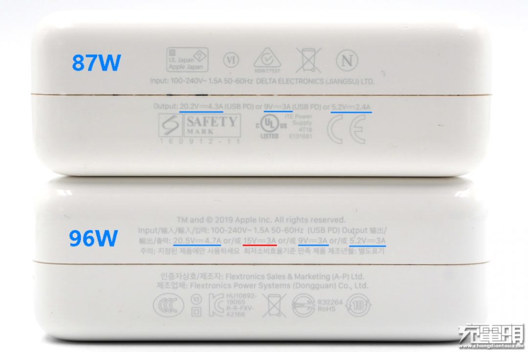 87W充电器支持20.2V/4.3A、9V/3A、5.2V/2.4A三个档位的输出,而96W充电器支持20.5V/4.7A、15V/3A、9V/3A、5.2V/3A四个档位的输出,96W充电器新增了一个15V/3A的档位,适应范围更广,能兼容更多不同需求的设备。