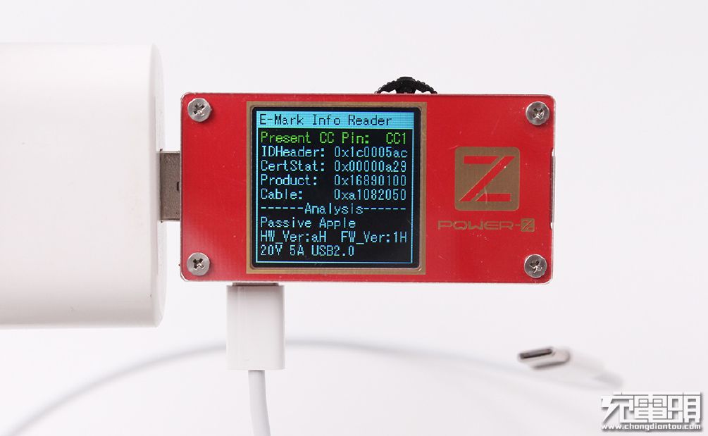 这是一根雷电线,从POWER-Z测试仪屏幕里可以看到他与上面的5A线的E-marker一样,都支持了20V/5A 100W电力传输能力,除此之外,数据传输能力还支持40Gbps传输速率,已经超出POWER-Z读取范围。不管是5A线还是雷电线,他们都可以让苹果96W充电器满功率输出。