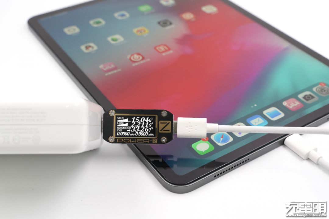 用96W充电器给iPad Pro 11进行充电测试,实测电压15.04V,电流2.21A,功率33.26W,开启PD快充。