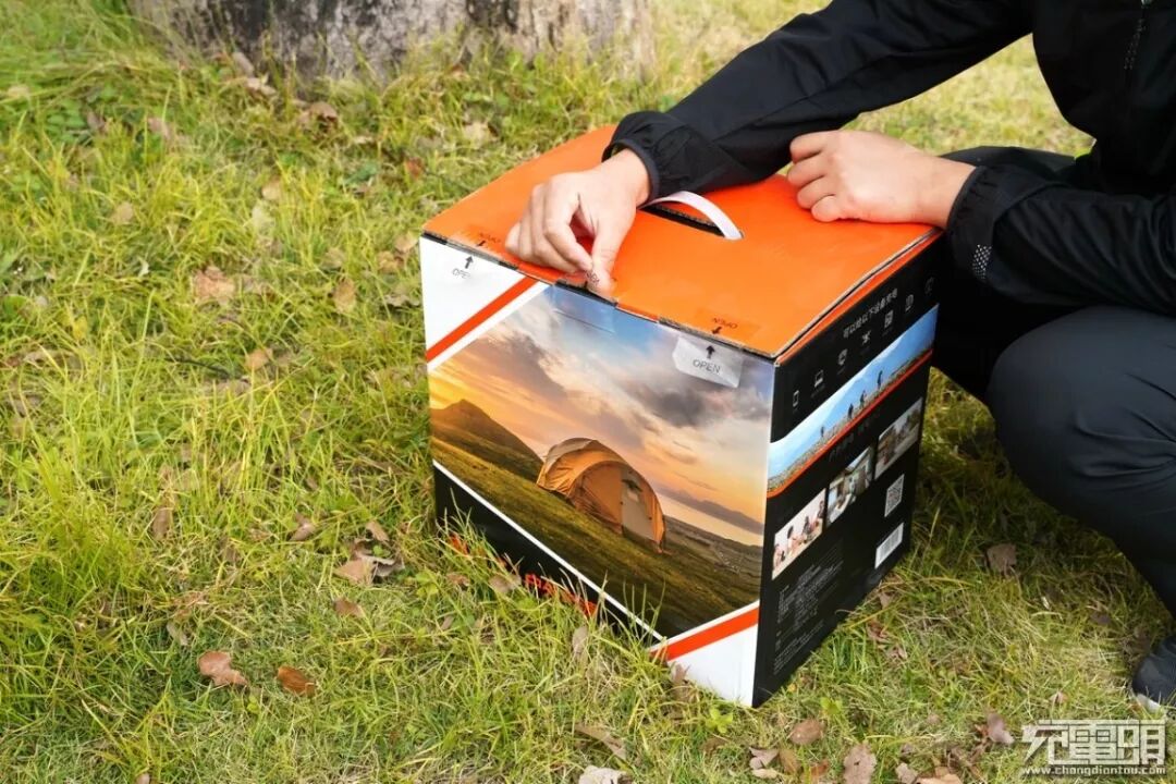 包装的另一侧,勾勒出了这款产品的使用场景,在夕阳即将落山的时候,在野外搭一顶帐篷,拿出电小二户外电源,即使夜晚降临也无需担心,因为有电小二户外电源,可以驱赶黑暗,让我们身处光明之中。