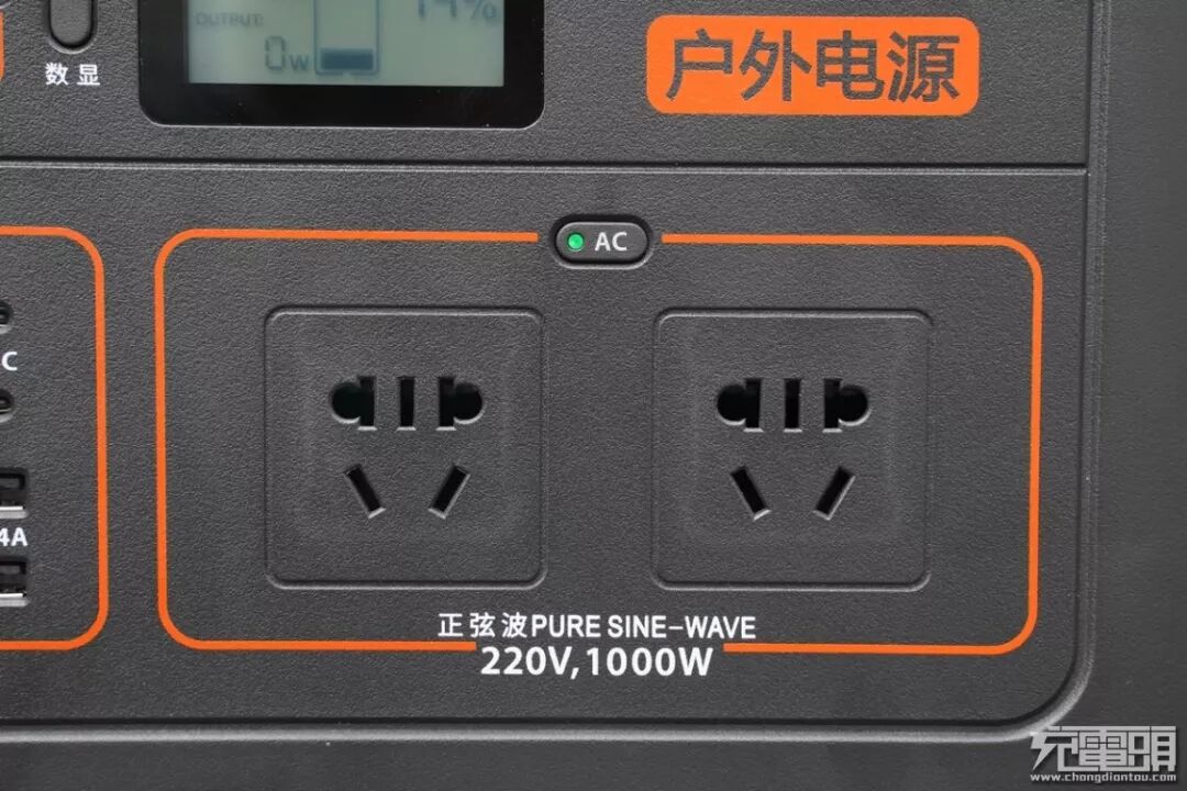 在正面面板的右下角,可以看到用橙色线条规划分明的输出接口,220V正弦波输出电流,可媲美市电的电流,波形稳定,对充电设备不会造成损害,使用更放心。同时在上方橙色线条区域还设置有单独的按键说明,“AC”代表220V 输出区域,自带的绿色电源指示灯可以清晰的看出用电状态,按下电源按键,绿色指示灯亮起,表明AC输出接口的区域已经通电,可以正常使用。