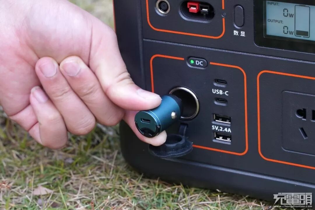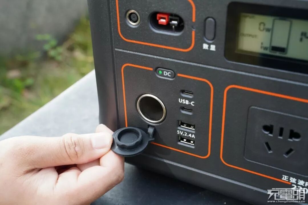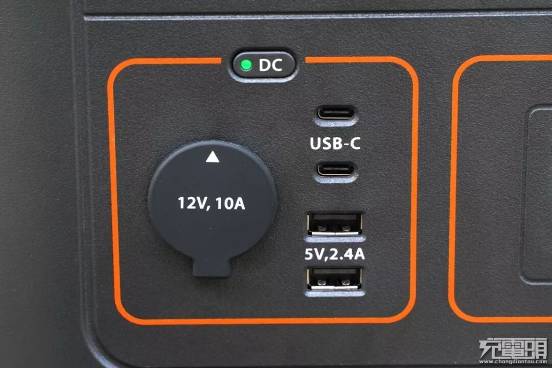 产品自带车充输出接口,支持最高120W输出,旁边从上至下罗列了两个USB-C和两个USB-A共四个输出接口,而且橙色规划区域的顶部还单独设立开关,并且标识“DC”字样,按键的上面设有绿色指示灯,用户可以选择点击开关按键绿色指示灯亮起表示该DC区域已经通电可以正常使用了。