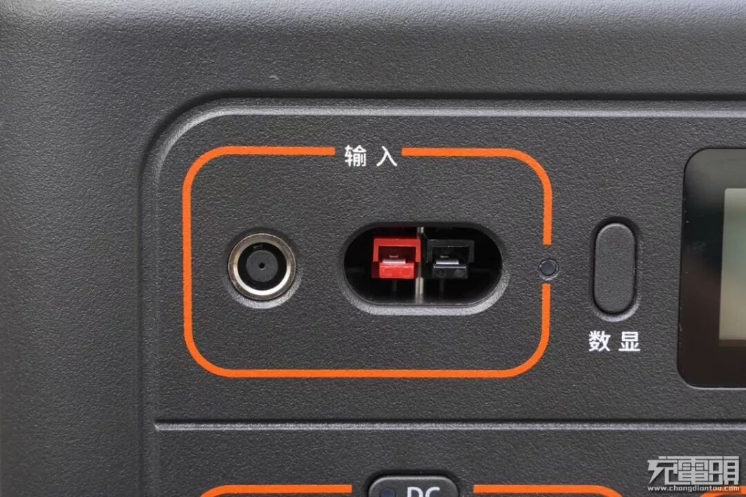 产品左上方为输入区域,可以使用自带的220V充电器用室电为其充电,也可以在车上使用自带的车充充电器为其充电,此外产品还支持安德森输入接口,同样支持安德森接口的充电器为其充电。在橙色线条的中间部分带有电源指示灯,当输入接口通电时,指示灯亮起,表明已经在为产品输送电量了。