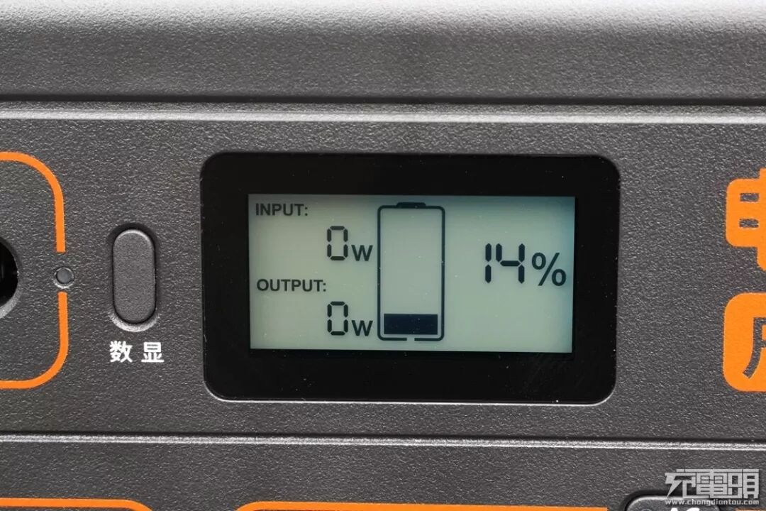 中间靠上部分为产品自带的液晶数字显示屏,可以显示当前剩余电量百分比以及输出(INPUT)输出(OUTPUT)的具体功率。