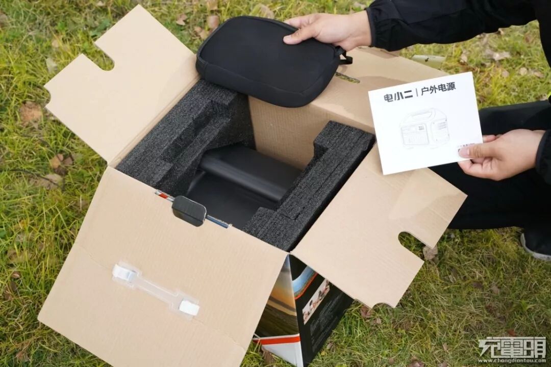 打开外包装,顶部放置了一个黑色的小包,额外还带有一本电小二户外电源1000的使用说明书。