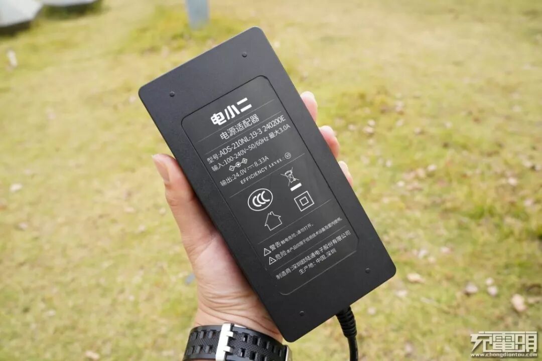 产品自带的充电器,体积稍大,一直手刚刚好能拿下,上面的输出参数为24V8.33A,功率为199.92W 。