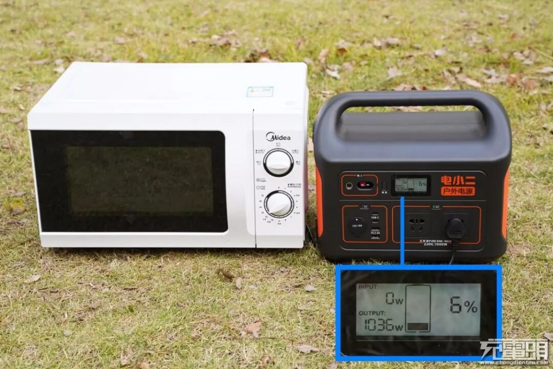 终于到了令人激动的输出测试部分了,使用微波炉测试电小二1000的输出功率,由放大的显示屏可以看到输出(OUTPUT)功率已经达到了1036W,符合参数中宣称的输出1000W的标准。