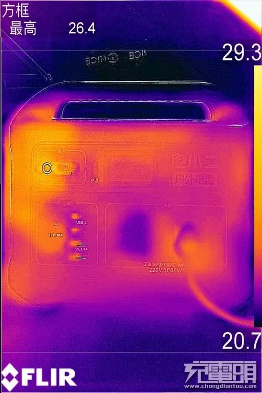 对电小二户外电源1000进行AC 满载输出半小时测试,半小时过后,由热成像仪显示出的温度来看最高温度为26.4° ,这个发热程度可以说是人体根本感觉不到的。
