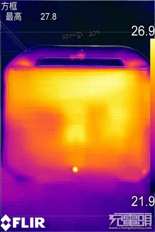 切换至背面,背面的最高温度和正面的最高温度相差不大,仅仅为27.8° ,这个温度正常人体是根本感觉不出来的,可以看得出来电小二户外电源1000对于温度的把控还是很不错的。