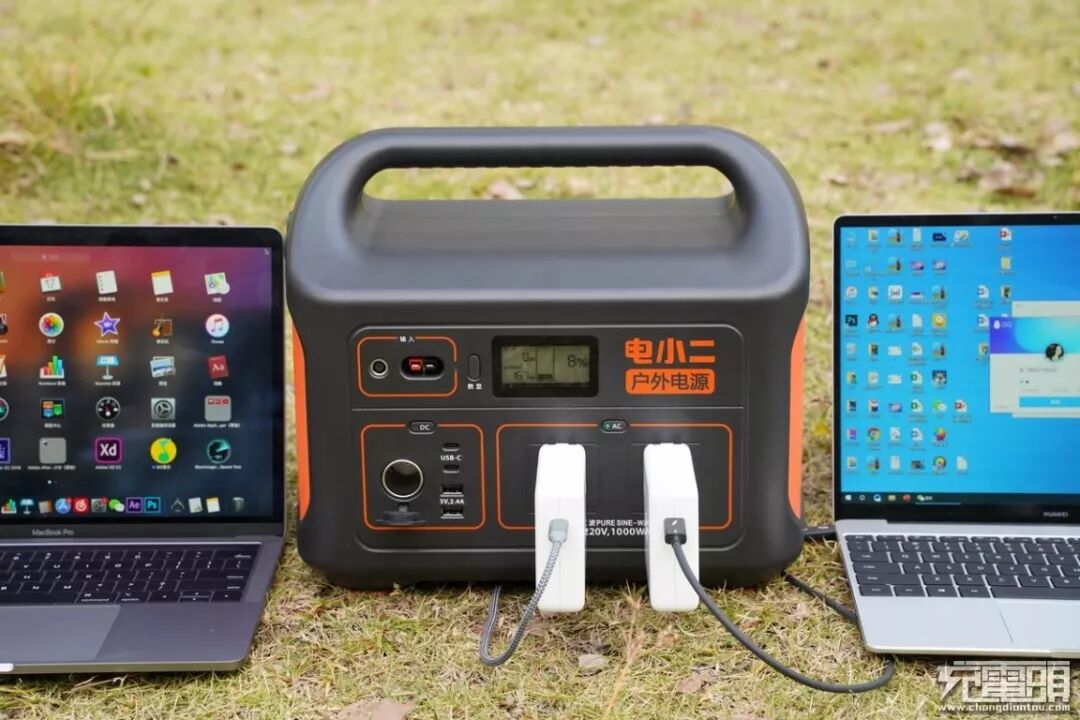 两个220V AC接口同时输出为两台笔记本电脑供电,电小二户外电源1000自带的显示屏上显示正在输出电量,由此得出,两个AC 输出接口是可以同时工作为电子设备供电的。