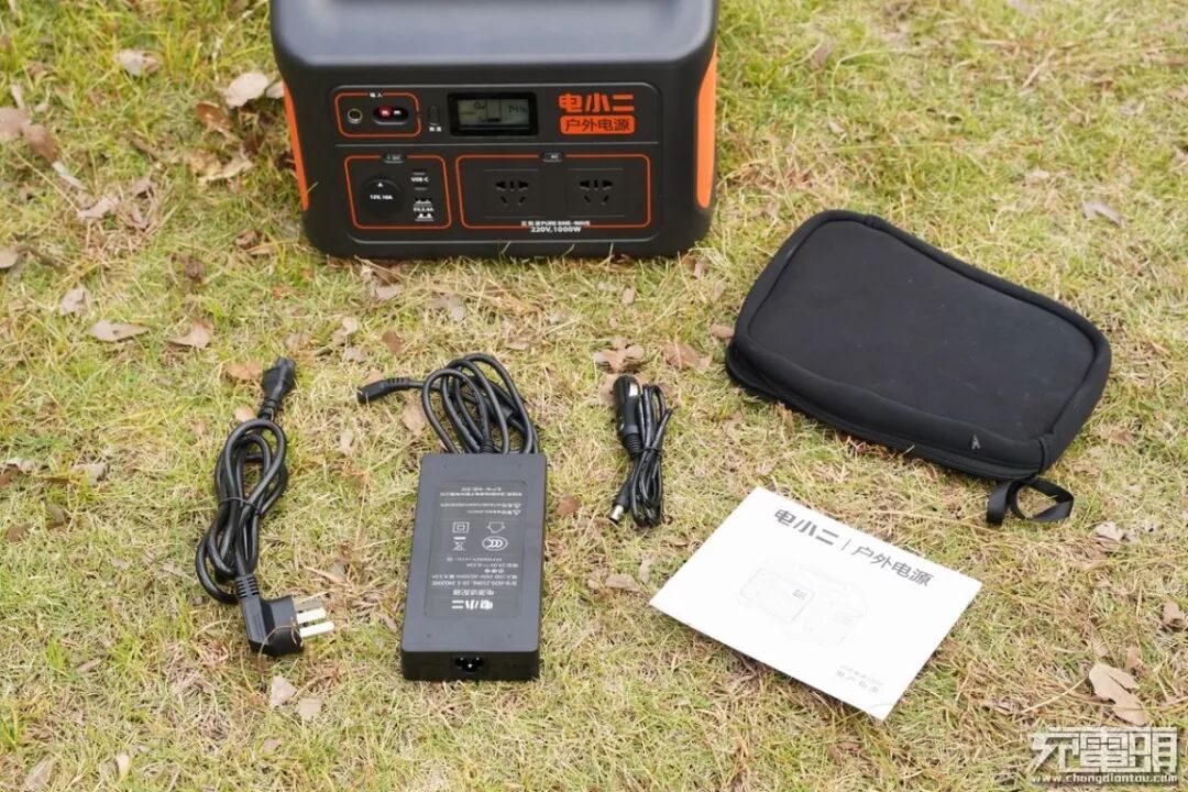包装内产品一览,包括了电小二户外电源1000、包含充电器的黑色小包、220V输入充电器和车充输入充电器以及使用说明书一份。