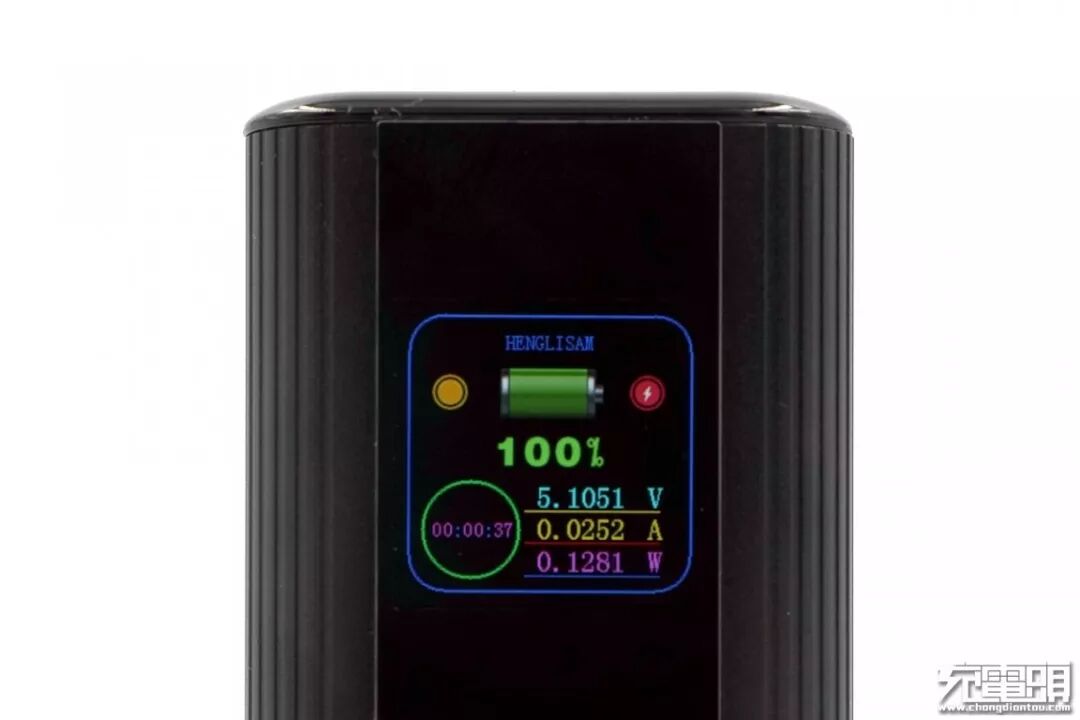 在移动电源的正面上方位置,自带一块液晶显示屏,可以精准显示移动电源在工作时候的电流电压以及功率,包括剩余电量以及屏幕点亮时间等数据。这样可以方便用户时刻精准掌握移动电源的具体信息,以及工作时的功率大小。