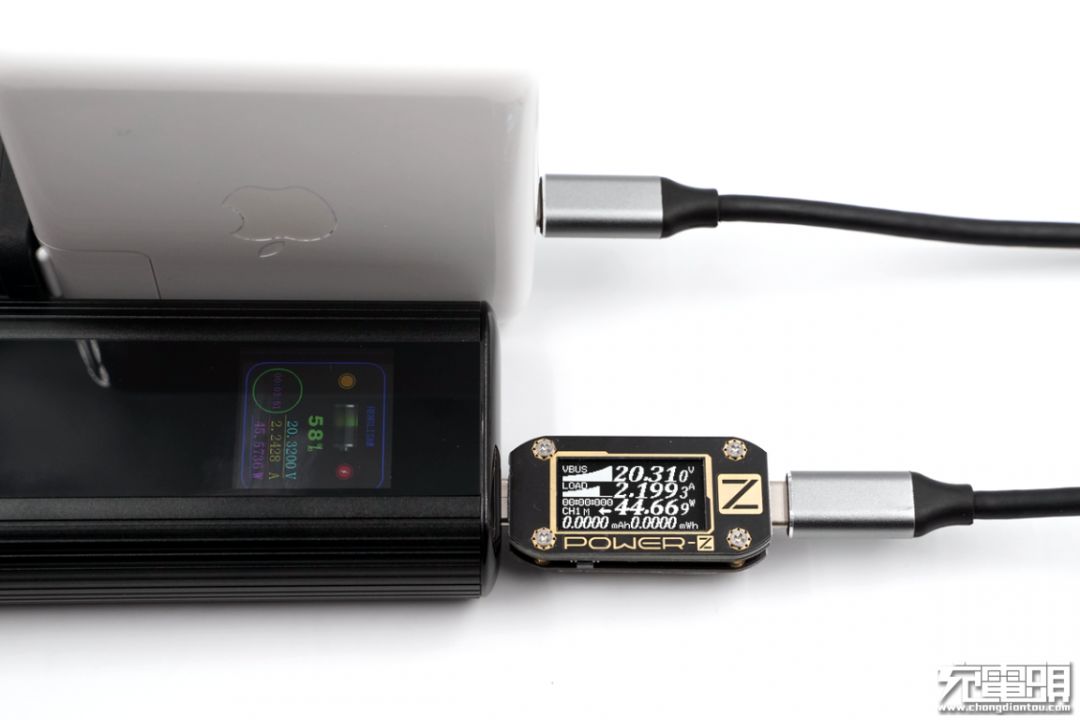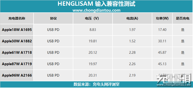 我们还分别使用了其他几种充电器对HENGLISAM移动电源进行输入兼容性测试,测试条件为Apple五种不同功率的PD充电器。由表中得知,在用18W和30W充电器进行输入时,功率都来到了充电器的功率的输出最大值;在用61W和87W以及96W的充电器对HENGLISAM移动电源进行输入时,功率均来到了45W左右,符合参数中的最大功率输入。