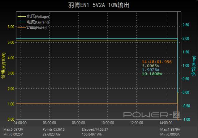 对羽博EN1储能电源进行输出测试,测试条件为以5V2A 10W的输出功率进行测试,整体过程输出电流电压均为稳定输出状态,在经历了14小时48分的输出时,功率最后维持在了10.18W,随后下降,此时充电完成。全程耗时约14小时48分。放出的能量约为150.84Wh,所以在以5V2A 10W的功率输出时,效率约为150.84/155=97.31% 。