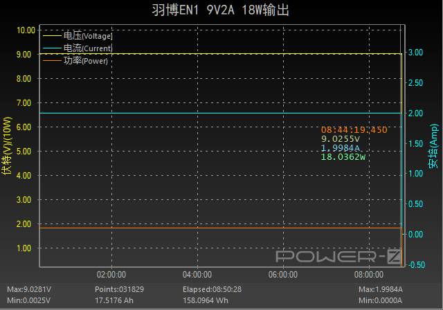 接下来对羽博EN1储能电源以9V2A 18W的功率进行输出测试,整体测试过程中电流电压均为稳定输出状态,8小时44分钟时,功率最后维持在了18.03W,随后下降,此时充电完成,全程耗时约8小时44分。放出的能量为158.09Wh,所以在以9V2A 18W的功率进行输出时,效率约为158.09/155=101.99%