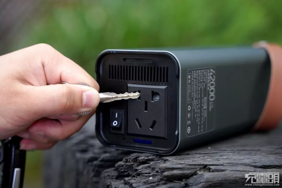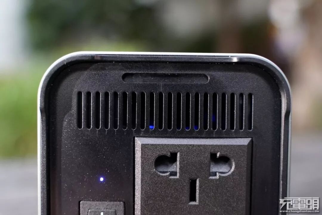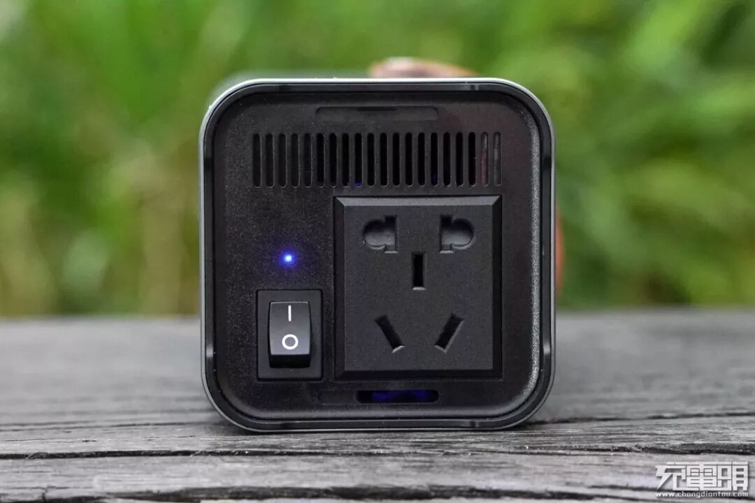 产品底部为220V输出接口,最大支持150W的输出功率,接口支持标准220V的双插脚的充电器以及带有地线的三插脚充电器使用。