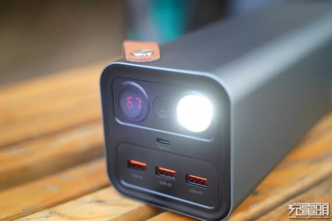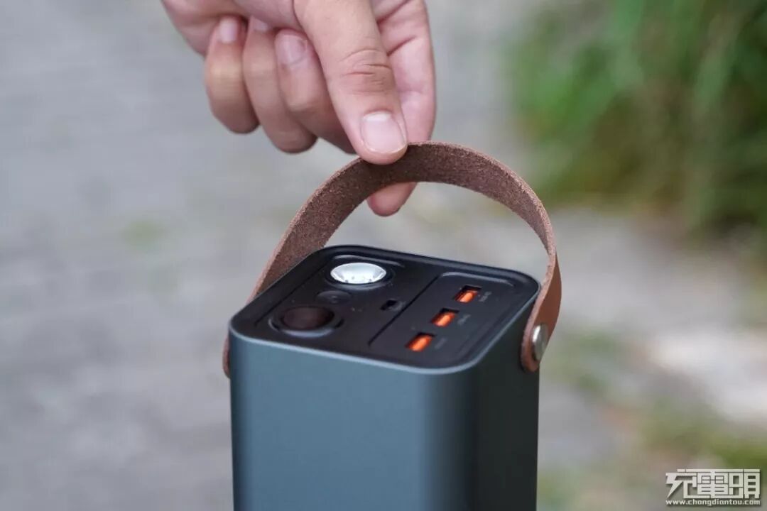 设计方面,以其灰色的外观,体积远低于其他户外电源的形态面向消费者,并带有皮质提手,为用户的出行提供更多方便,出门直接拎着想走就走;同样带有LED高亮灯设计,并支持常亮和SOS两种模式,即使在户外的晚上也无需担心黑夜的问题。底部四个角落各延伸出一部分用于在摆放产品时加高底部,不会磨损输出接口。自带液晶显示屏设计,剩余电量精准看到了然于心,出门更放心。