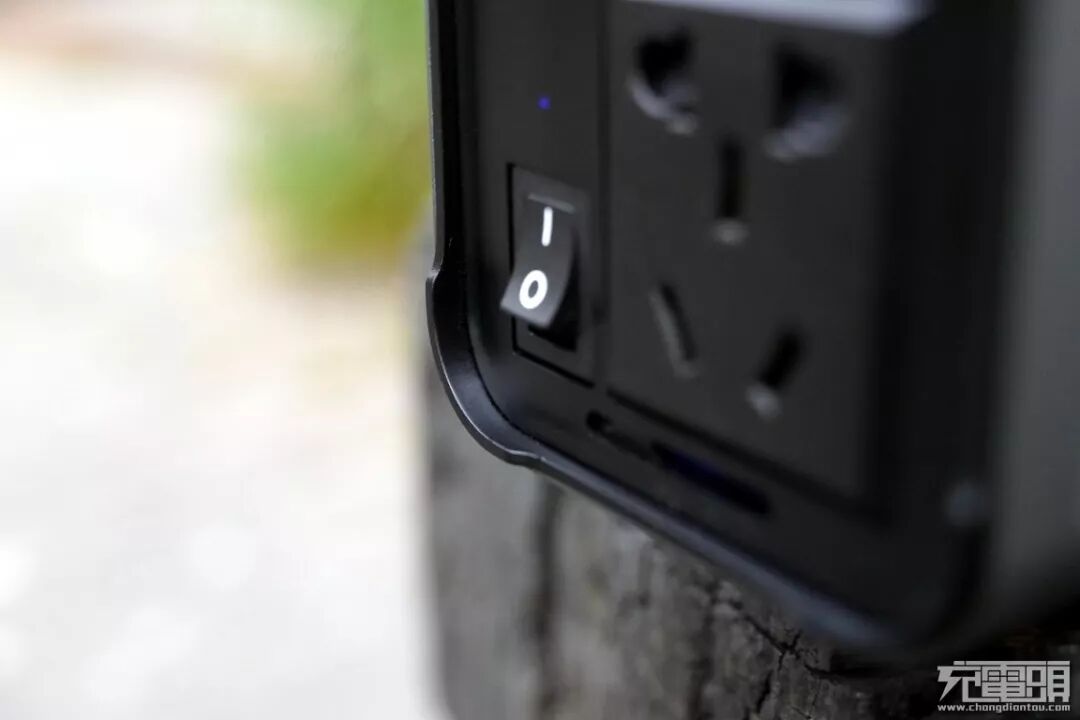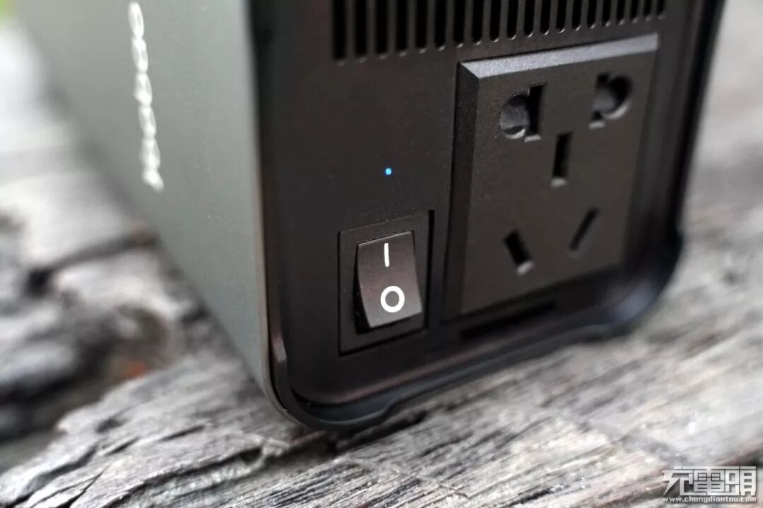 在输出口的旁边带有220V插口的启动开关,用户可以自由决定是否需要通电使用,同时在开关键的上面还有一个蓝色指示灯,当220V输出口有电的时候蓝色指示灯会亮起,告知用户220V插口现在是通电的状态。清晰明了,方便用户的使用。