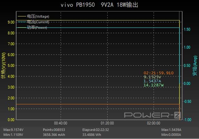 对移动电源以9V2A 18W的功率进行输出测试。测试过程中电压电流均持稳定输出状态,全程耗时约为2小时21分。放出的能量为33.48Wh,效率约为33.48/37=90.48%