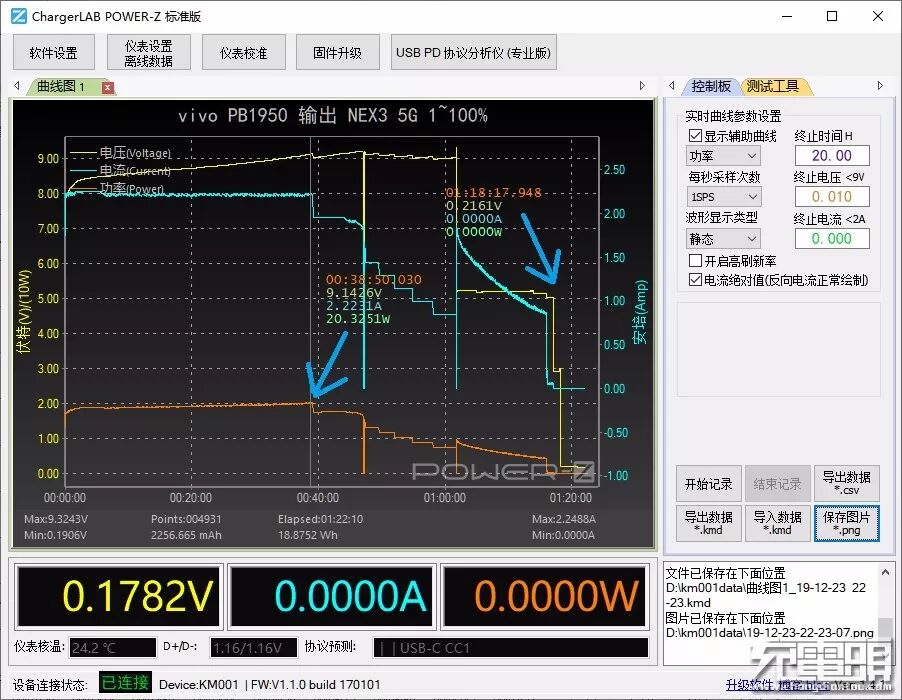 经测试,在为VIVO NEX 3 5G充电时最高功率达到了20.31W 。给VIVO NEX 3 5G充电仅仅耗时1小时18分钟就可以将4500mAh大电池容量充满。毕竟握手了10V2.25A 22.5W VIVO FlashCharge闪充,这个充电速度还是很快的。