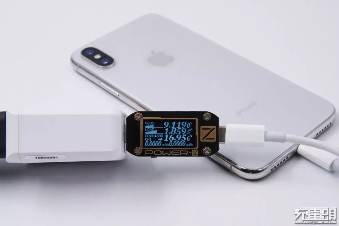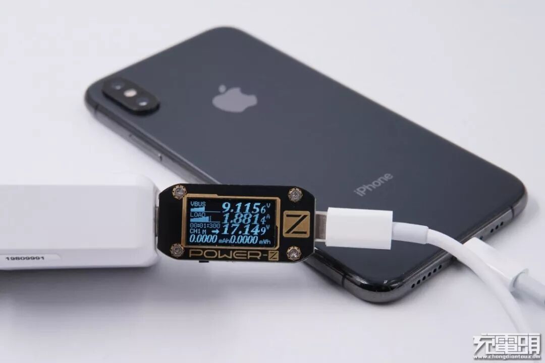 使用iWALK 18W充电器给iPhone X进行充电测试,实测电压9.11V,电流1.85A,功率16.95W,成功开启PD快充。