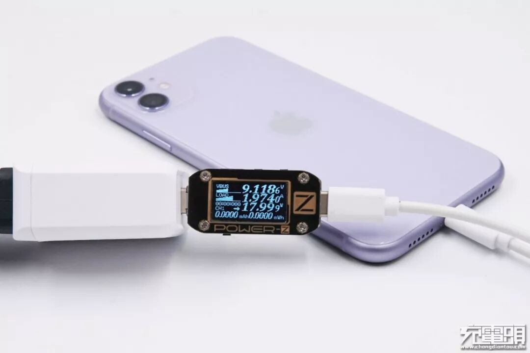 使用iWALK 18W充电器给iPhone 11进行充电测试,实测电压9.11V,电流1.97A,功率17.99W,成功开启PD快充。