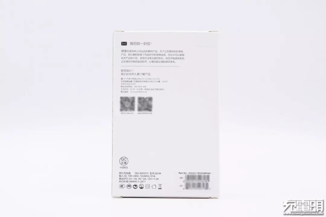 包装的背面有这款充电器的相关参数信息、一封iWALK品牌致用户的信、售后服务的联系地址,可以看出iWALK很注重用户的售后体验。