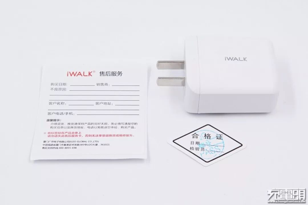 包装内含有:18W充电器一个、iWALK售后服务单一份、产品合格证一份。