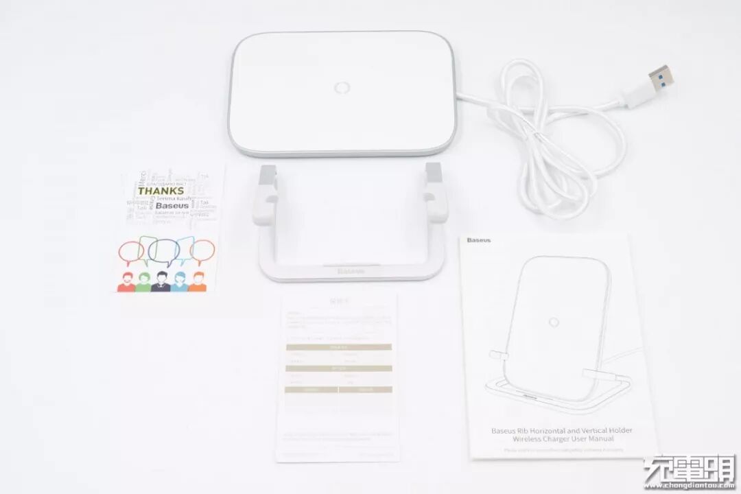 包装内含有:集成线材的无线充电器一个、铝合金支架一个、宣传页一张、保修卡一张、无线充说明书一份。