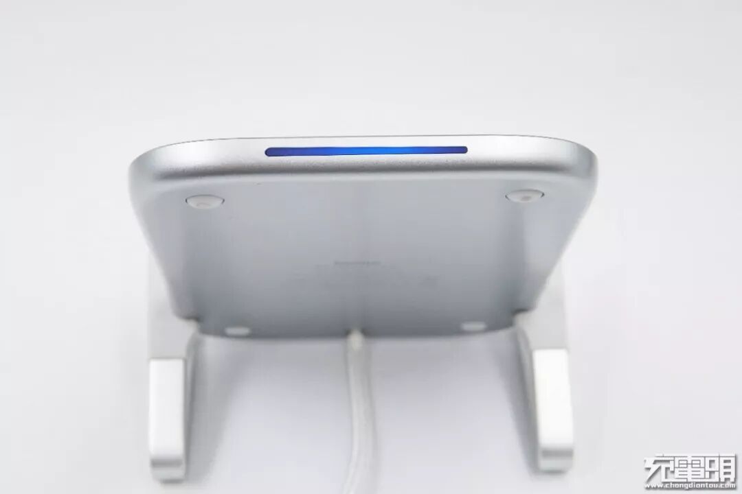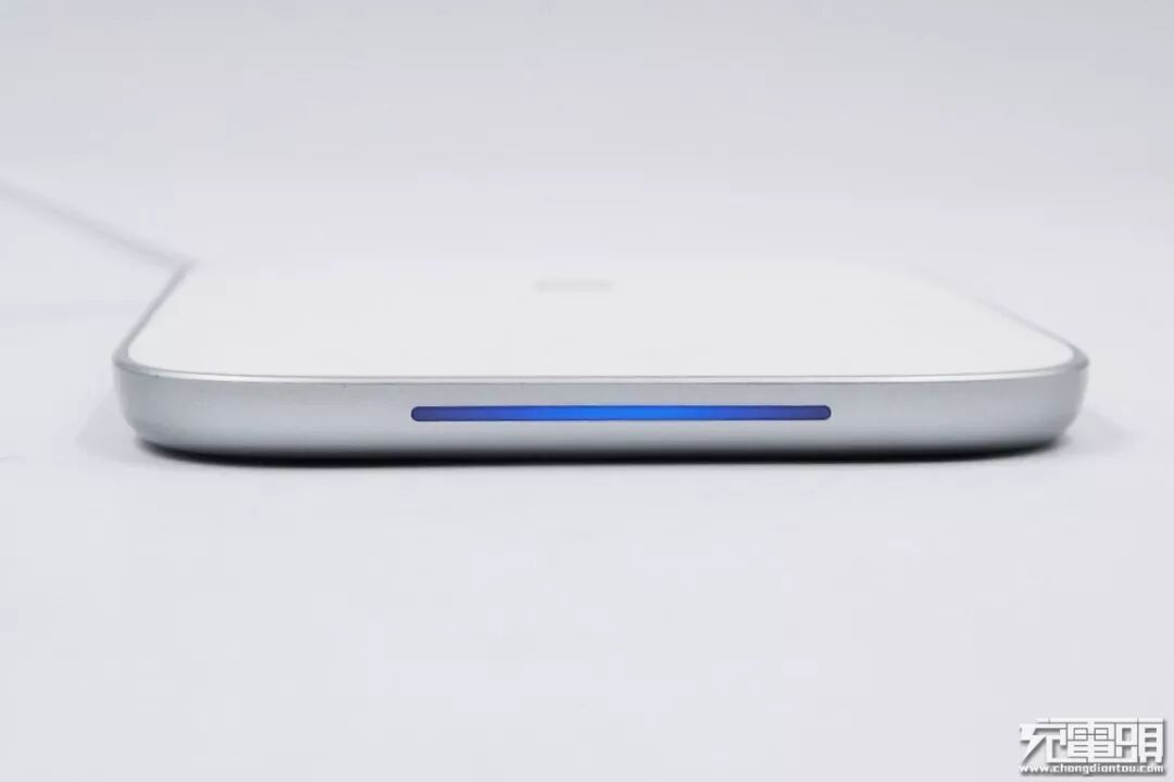 无线充电器带有通电指示灯,形状为细长条状,通电后正面底部的指示灯会亮起淡蓝色灯效,用户可以根据指示灯判断当前的通电状态,指示灯也可以作为夜间寻找灯源的工具。