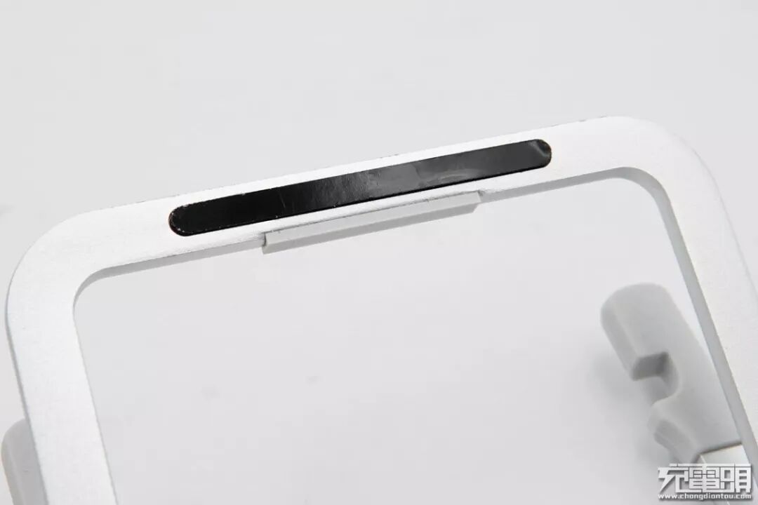 无线充支架的正面粘贴有一小块硅胶垫,用于固定手机,防止手机在进行充电时滑落。