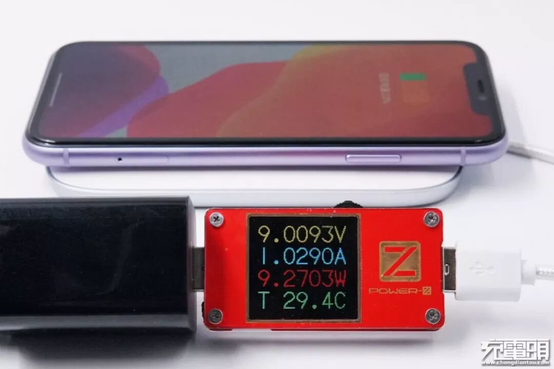 使用倍思排骨无线充电器给iPhone 11进行无线充电测试,实测电压9.00V,电流1.02A,功率9.27W,成功开启苹果7.5W无线快充。