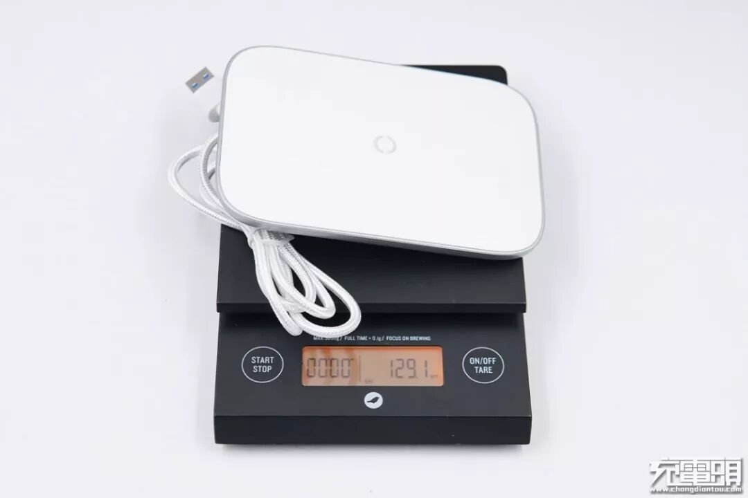 无线充电器背后内置了一条白色的电源线,线材为编织材质,编织线的抗弯折性能更好,更为耐用。