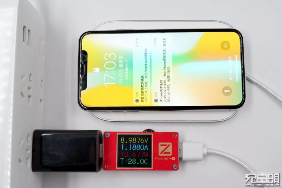 使用倍思排骨无线充电器给iPhone X进行无线充电测试,实测电压8.98V,电流1.18A,功率10.67W,成功开启苹果7.5W无线快充。