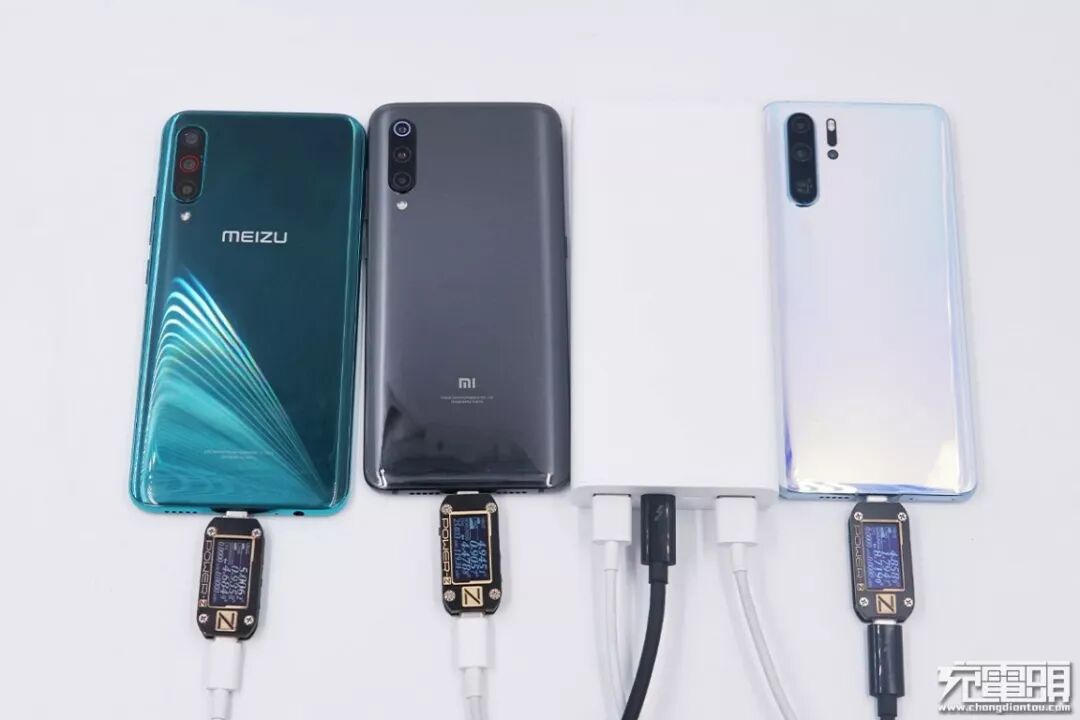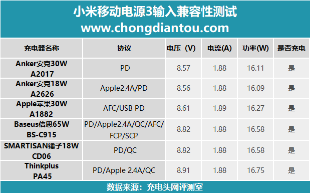我们还找来了六款充电器对移动电源的输入进行了测试,测试结果发现充电器在为移动电源充电的时候均可以正常握手9V电压档位,成功开启PD快充模式,并且功率都超出了16W,符合参数中最大输入18W的描述。