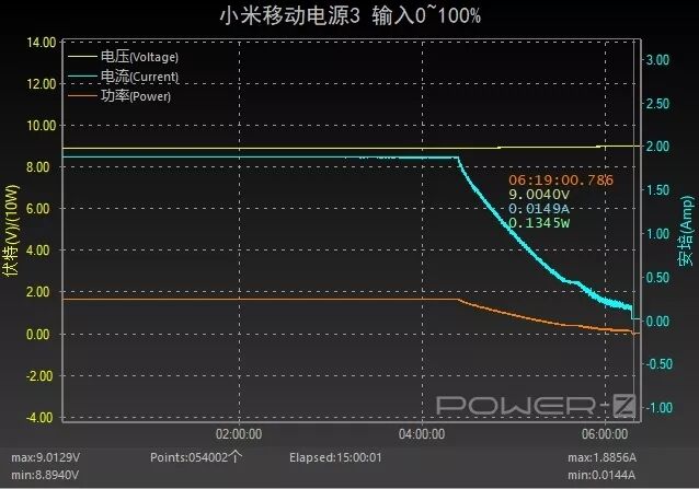 最后对移动电源的输入进行测试,在约4小时24分前,电压电流功率平台均持稳定输入状态,最高功率为8.89V 1.87A 16.71W,最后电流功率开始出现逐渐下滑趋势,全程耗时约6小时19分。
