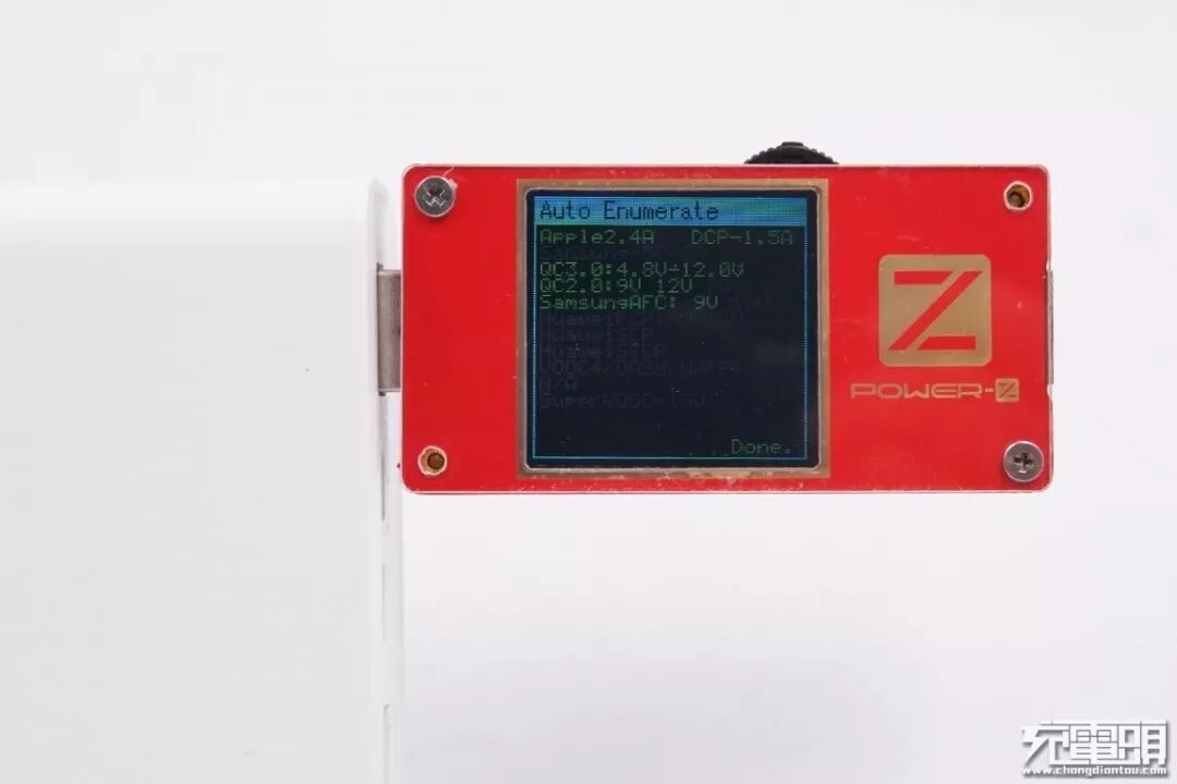 使用POWER-Z KT001对移动电源的USB-A进行快充协议检测,由测试表中的显示屏中得知支持Apple2.4A、QC、AFC等快充协议。