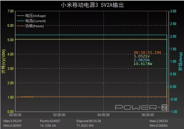 对移动电源的输出进行测试,测试条件为以9V 2A 10W的功率进行输出,测试全程电压电流功率平台均持稳定输出状态,最高功率为5.04V 2.06A 10.41W,全程耗时约6小时50分,放出的能量为71.30Wh,所以移动电源在以5V 2A 10W的功率输出时效率约为71.30/74=96.35% 。