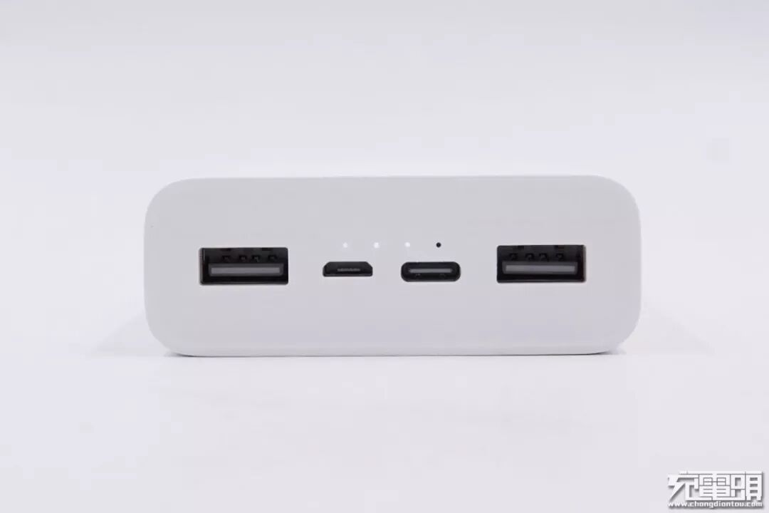 移动电源顶面从左往右分别是:USB-A输出接口、USB-Micro输入接口、LED指示灯(工作时亮白光)、USB-C双向快充接口、USB-A输出接口,并且在中间位置带有四颗电量指示灯,每颗指示灯代表25%的电量,由图中得知还剩75%的电量。