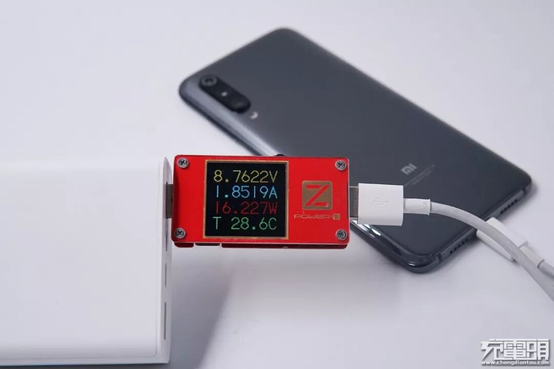 使用移动电源的USB-A为小米9充电,功率为8.76V 1.85A 16.22W,成功握手9V电压档位,开启QC快充。