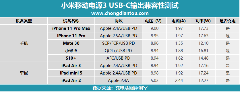 我们还找来了五款手机和3款平板对移动电源进行输出测试,测试下来发现iiPad Air 2成功握手Apple2.4A快充协议,剩下的设备均可以成功握手9V电压档位,开启PD快充。