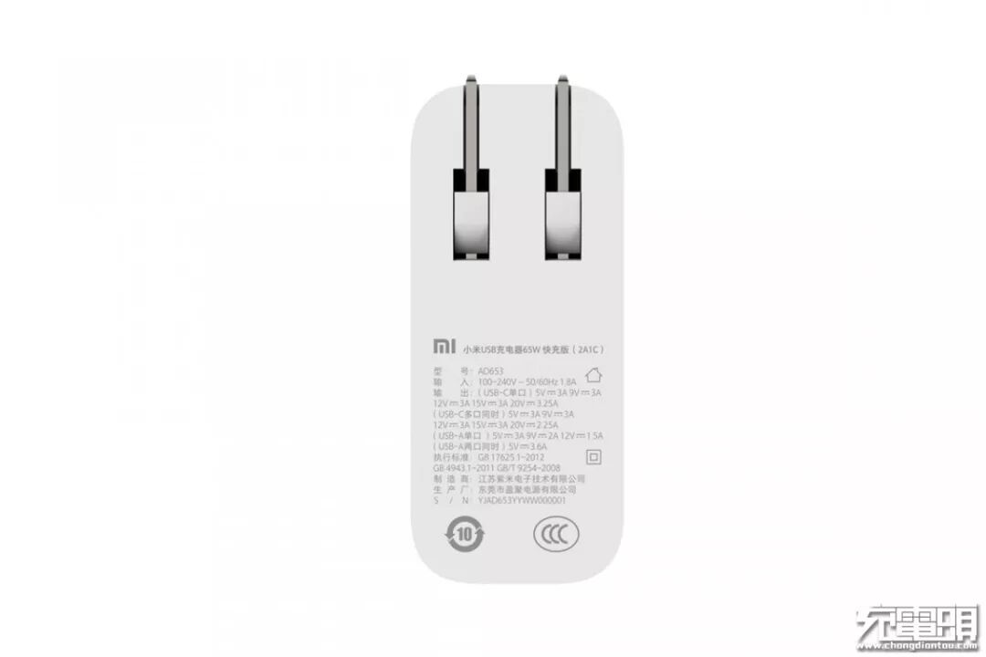 从铭牌上可得知,品名全称为小米USB充电器65W快充版(2A1C),型号为AD653,制造商:江苏紫米电子技术有限公司,生产厂:东莞市盈聚电源有限公司。小米2A1C充电器的制造商与生产厂与紫米2A1C充电器相同,但从单口功率策略、得天独厚的40W mi ChargeTurbo来看,小米2A1C与紫米2A1C不是相同的产品。