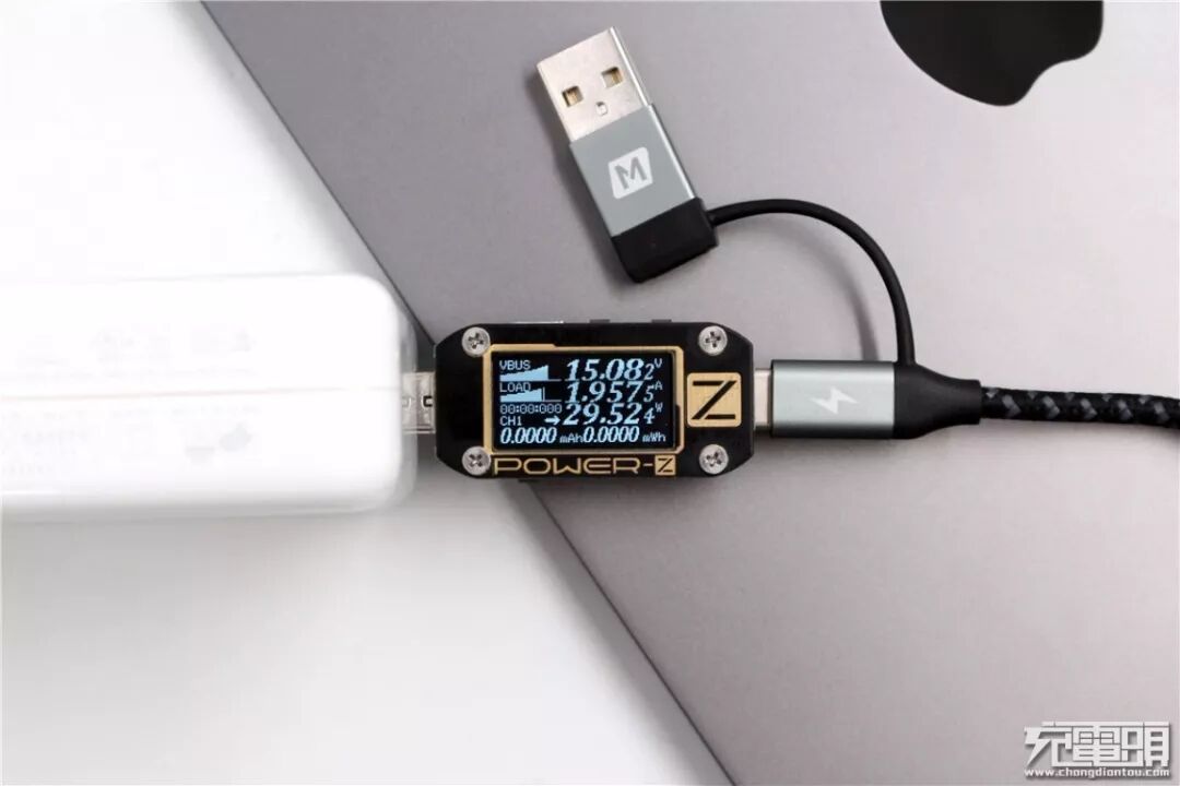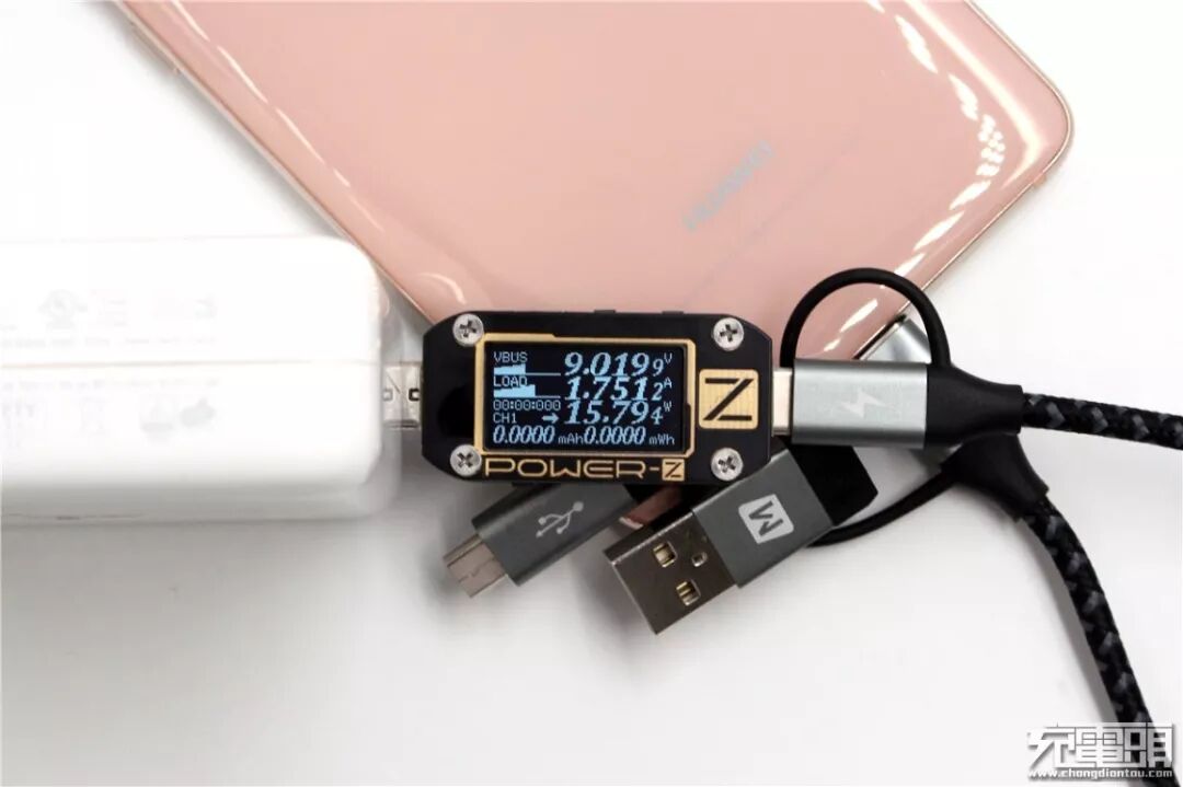 我们先拿华为Mate 10与苹果61W充电器做下测试,在以往的测试中得知苹果61W充电器是可以给华为Mate 10进行快充的。使用MOMAX 四合一数据线的USB-C to USB-C形态作为充电线材,实测华为Mate 10开启了PD快充,功率达15.79W(9.01V/1.75A)。